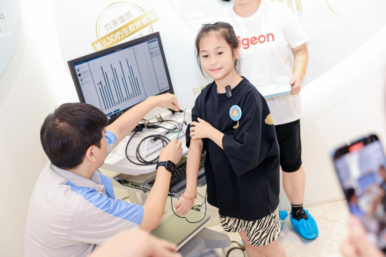 贝亲特别为孩子们准备了一场有趣的“认识皮肤小课堂”。专业的皮肤测试仪器吸引了所有小朋友的注意,他们好奇地围在仪器旁,看着老师现场演示如何检测皮肤状态,向孩子们讲解皮肤构造和贝亲仿生胎脂产品的保湿原理,用专业仪器检测自己的皮肤状态,更是直观感受贝亲胎脂产品给肌肤带来的改变。