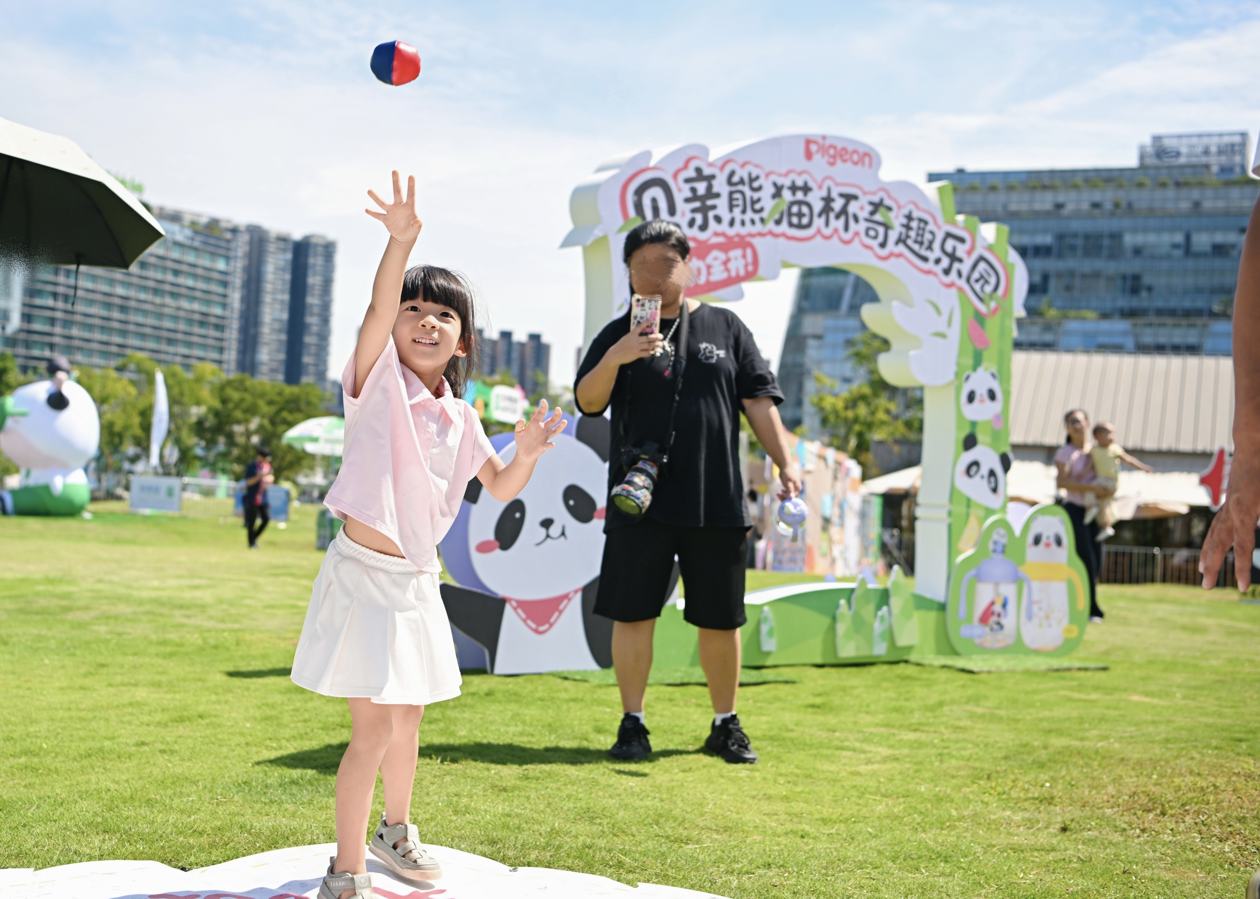 随着日头渐暖,乐园里的互动游戏让氛围愈发火热,将成都式的悠闲遛娃时光推向高潮。“投球大作战”区域,家长们陪伴孩子左右,小朋友们执起沙包奋力一掷。每当沙包掠过草坪,顺利击中投球板上的“熊猫杯”,孩子们便会高举双手爆发出清脆的欢呼 “中啦”,这一刻欢乐的亲子时光也悄悄住进孩子心里。现场的熊猫特色手举牌始终是“流量焦点”,孩子们拿着手举牌,开心地变换着造型,现场欢声笑语不绝于耳。