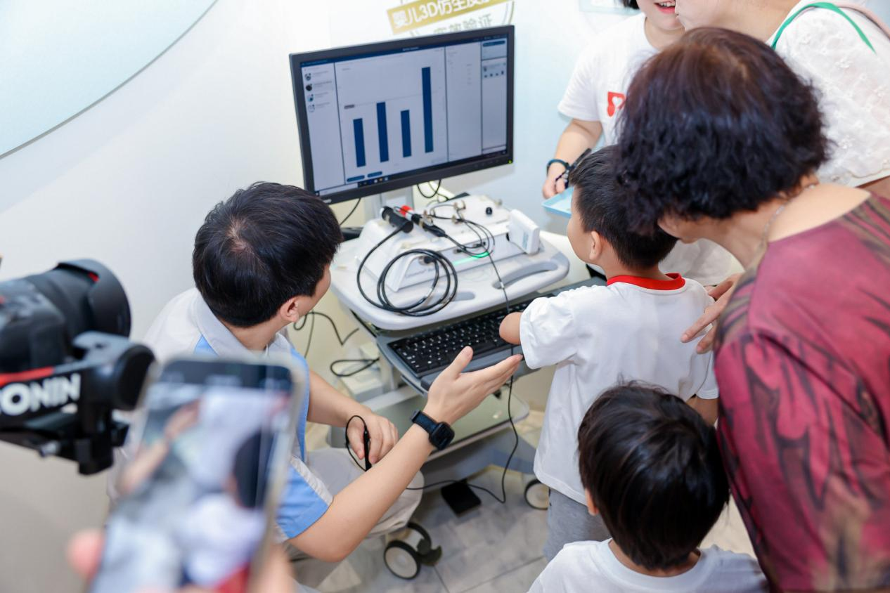 贝亲特别为孩子们准备了一场有趣的“认识皮肤小课堂”。专业的皮肤测试仪器吸引了所有小朋友的注意,他们好奇地围在仪器旁,看着老师现场演示如何检测皮肤状态,向孩子们讲解皮肤构造和贝亲仿生胎脂产品的保湿原理,用专业仪器检测自己的皮肤状态,更是直观感受贝亲胎脂产品给肌肤带来的改变。